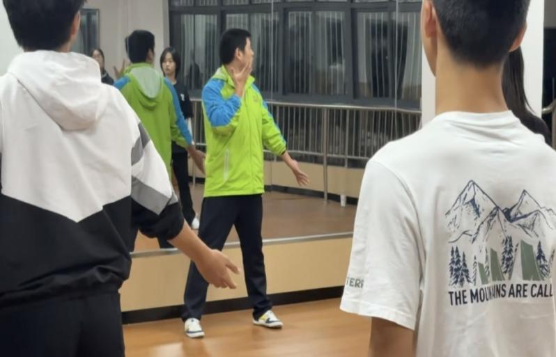 指导现场设在学校体育教学教室,队员们精神抖擞地依次展示四大功法。展示完毕后,专家当即指出细节问题,他边说边亲自示范,从指尖的朝向到腰背的弧度,将每个动作的发力点与呼吸节奏拆解说明,用半开玩笑的语气让队员们直观感受到“形气神合一”的练习要义。